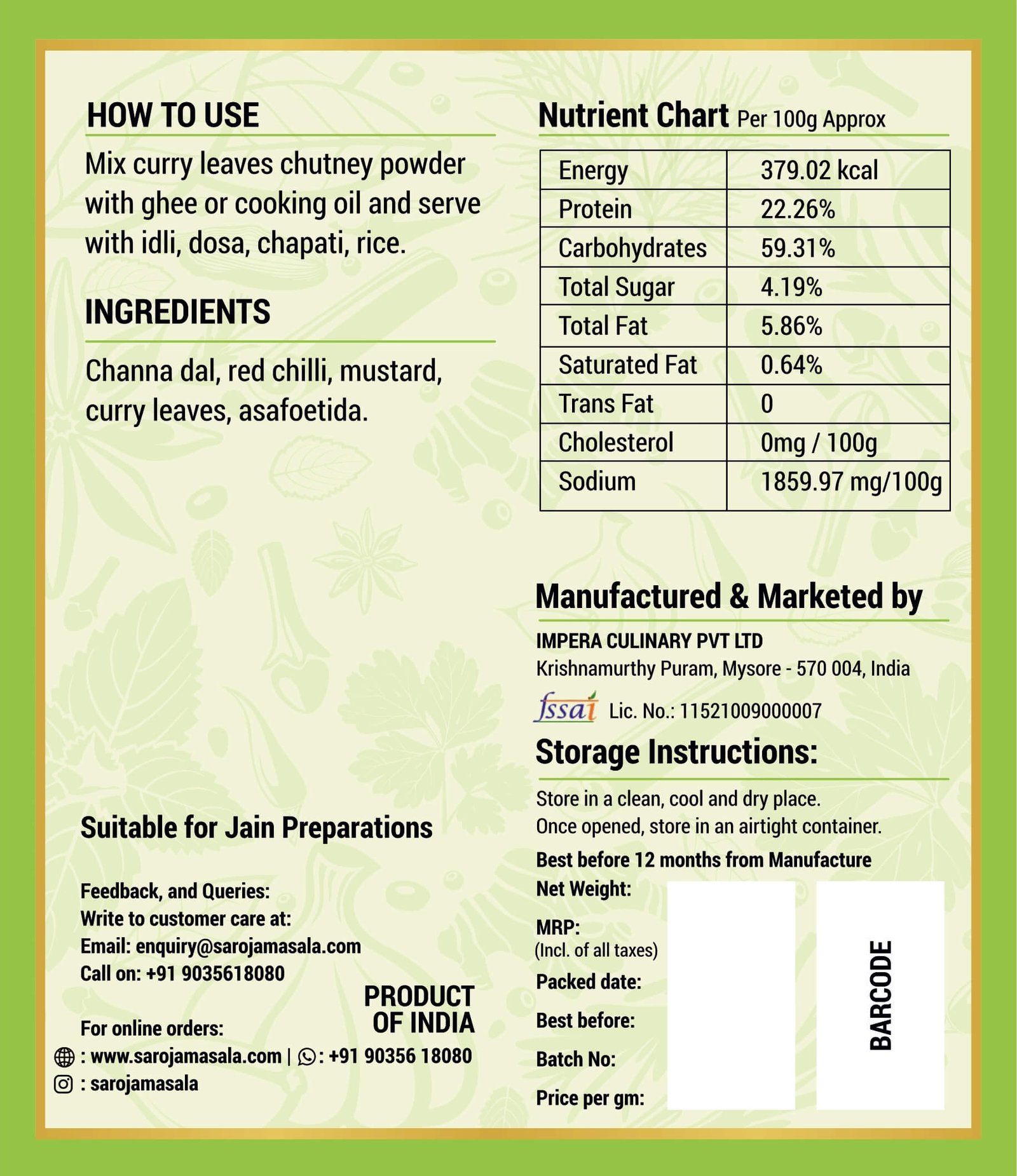 Our Curry Leaves Powder is known for its natural taste and nutritional value. It is hygienically processed and packed to retain its authentic aroma and flavor.