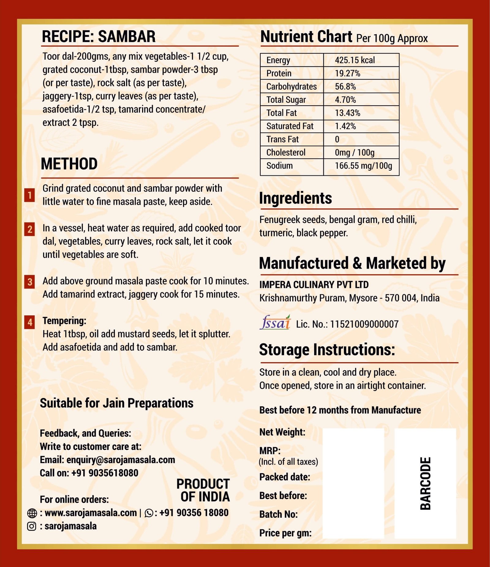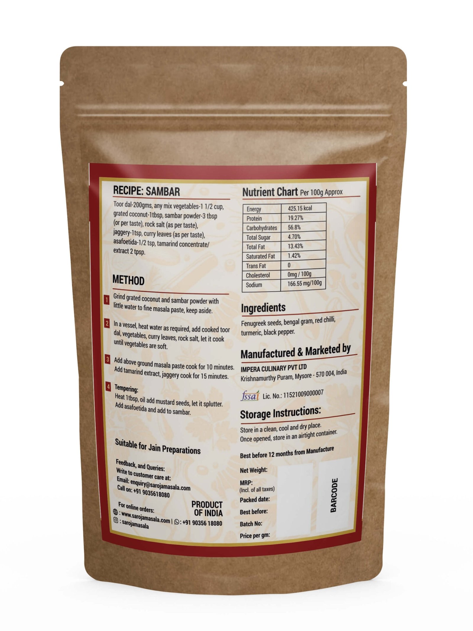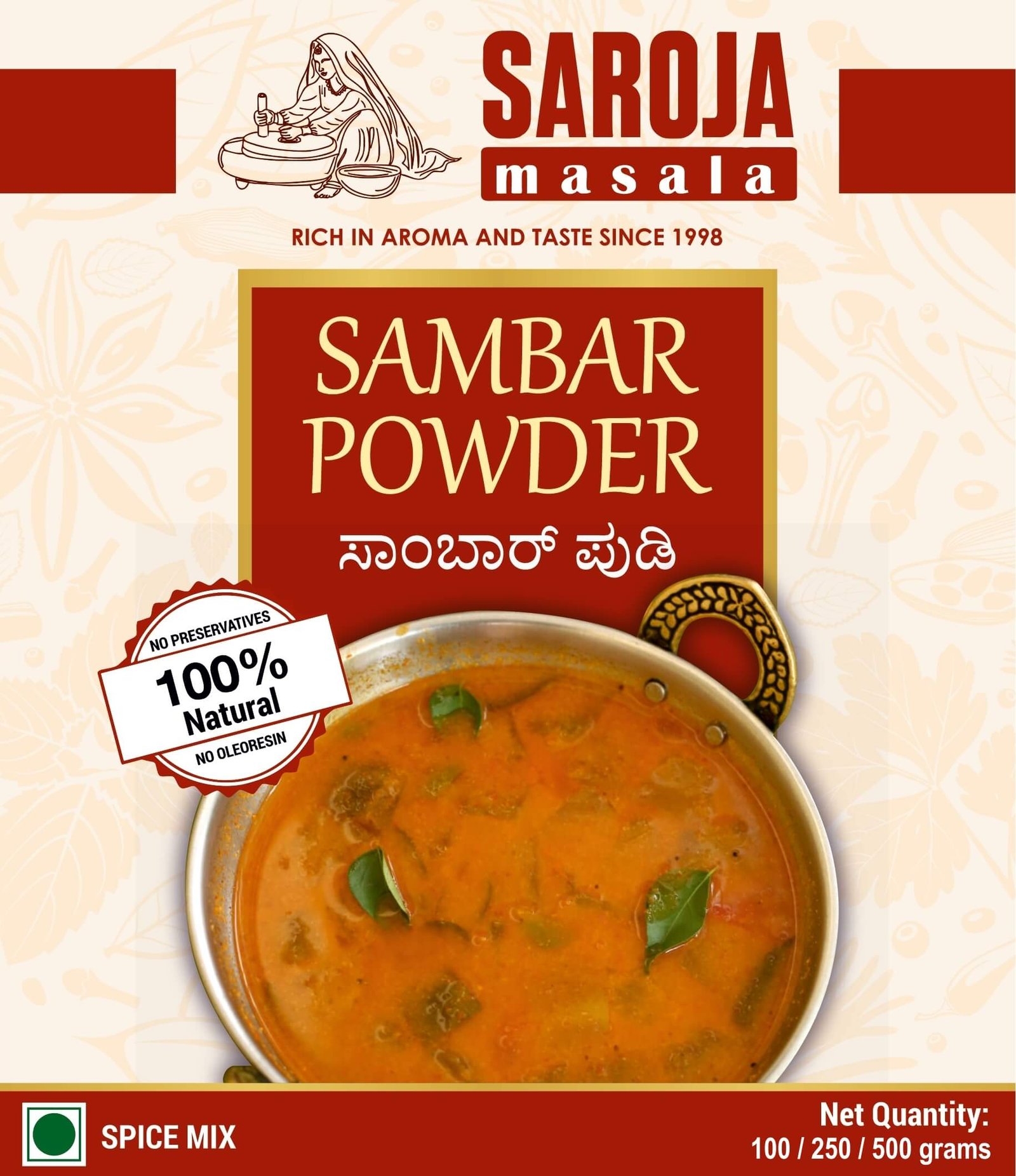 Our Sambar Powder is hygienically processed and packed to retain its natural flavor and aroma. It brings the authentic taste of South Indian home cooking to your kitchen.