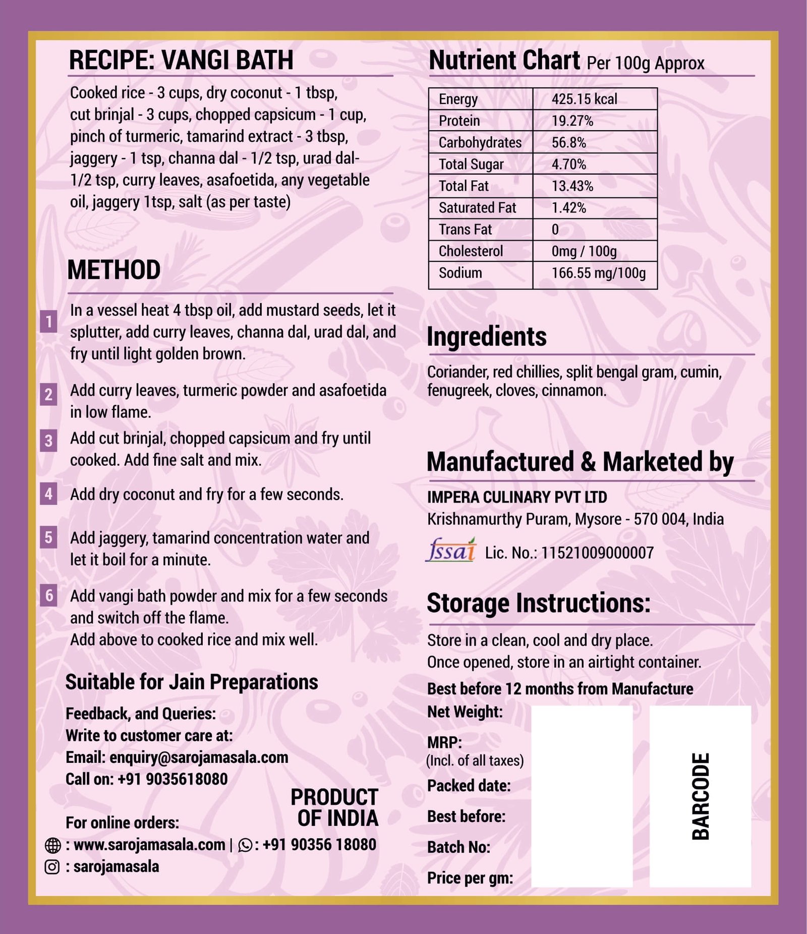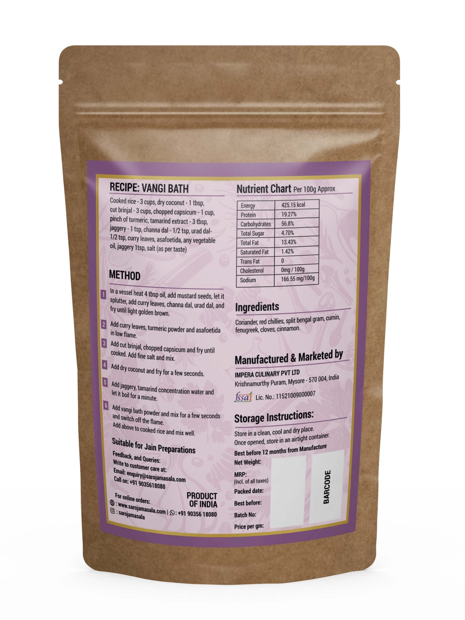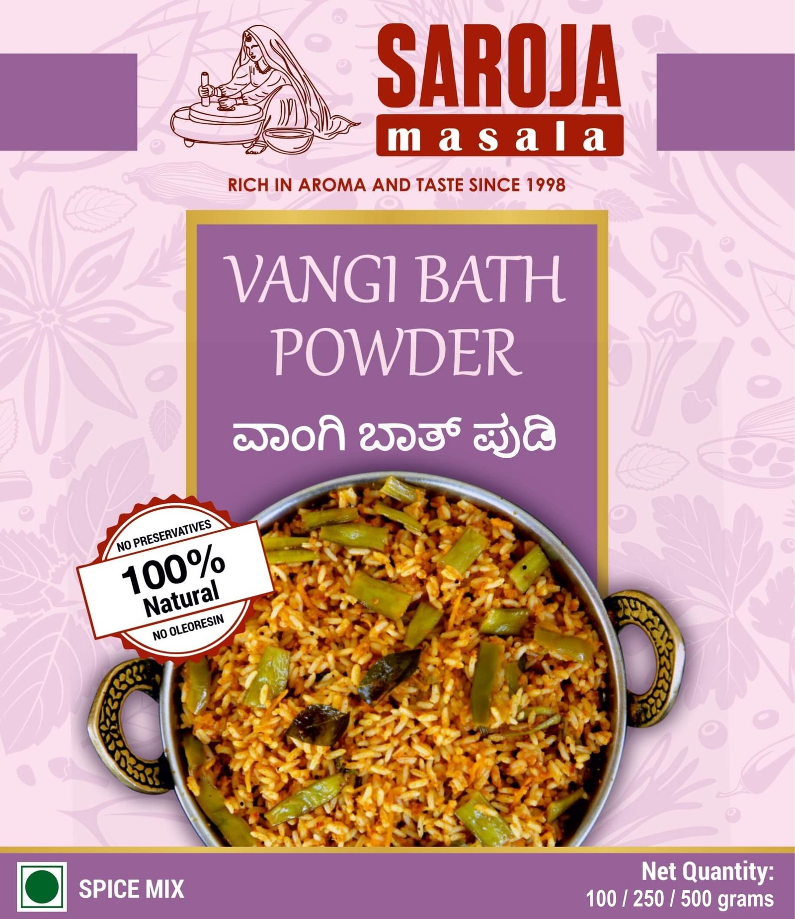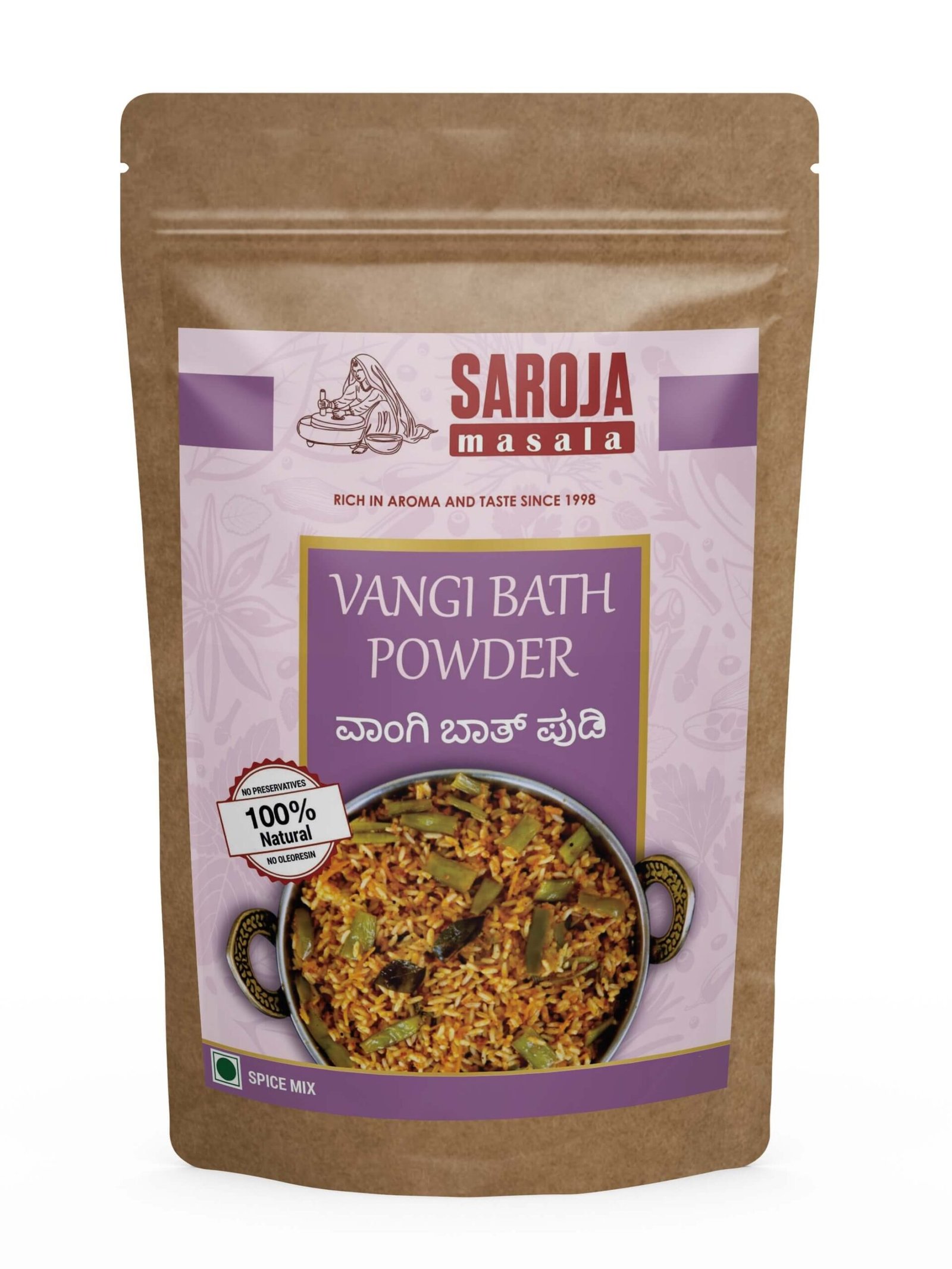 Vangibath Powder is a traditional South Indian spice blend used to prepare delicious brinjal rice with rich and aromatic flavors. At Saroja Masala, this powder is made using high-quality ingredients and authentic recipes to deliver consistent taste and freshness.